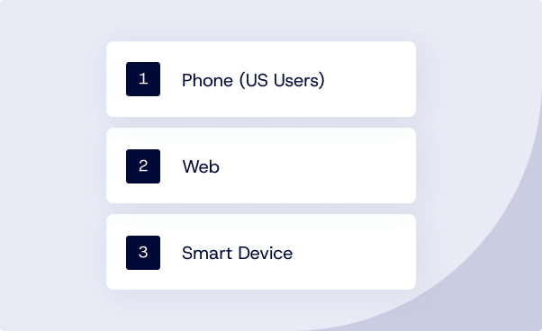 We offer several ways to connect: Phone (for US clients only), Web, and Mobile App (from Google Play or App Store).