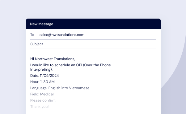 Schedule audio or video remote interpreting by emailing sales@nwtranslations.com at least 48 hours before your meeting.